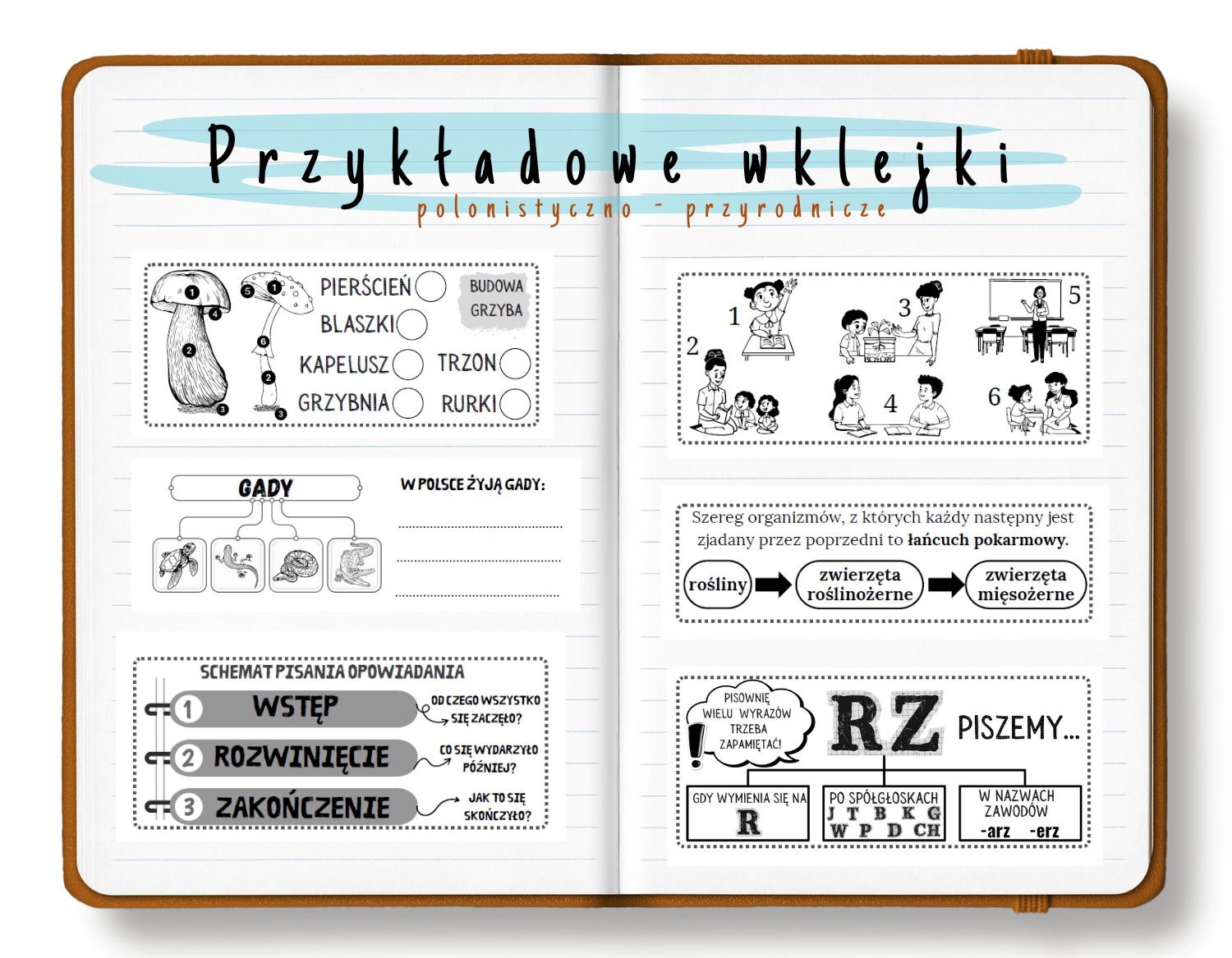 Wklejki zostały przygotowane w taki sposób, aby były jak najbardziej praktyczne i czytelne. Znajdziesz w nich treści informacyjne, które są kluczowe do zapamiętania ważnych informacji  oraz ćwiczeniowe, pomagające utrwalić omawiany z uczniami materiał. Dzięki naszym materiałom, nauka stanie się bardziej interesująca i efektywna!