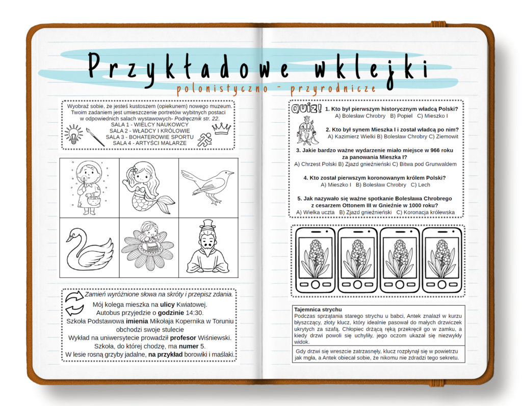 Wklejki zostały przygotowane w taki sposób, aby były jak najbardziej praktyczne i czytelne. Znajdziesz w nich treści informacyjne, które są kluczowe do zapamiętania ważnych informacji  oraz ćwiczeniowe, pomagające utrwalić omawiany z uczniami materiał. Dzięki naszym materiałom, nauka stanie się bardziej interesująca i efektywna!