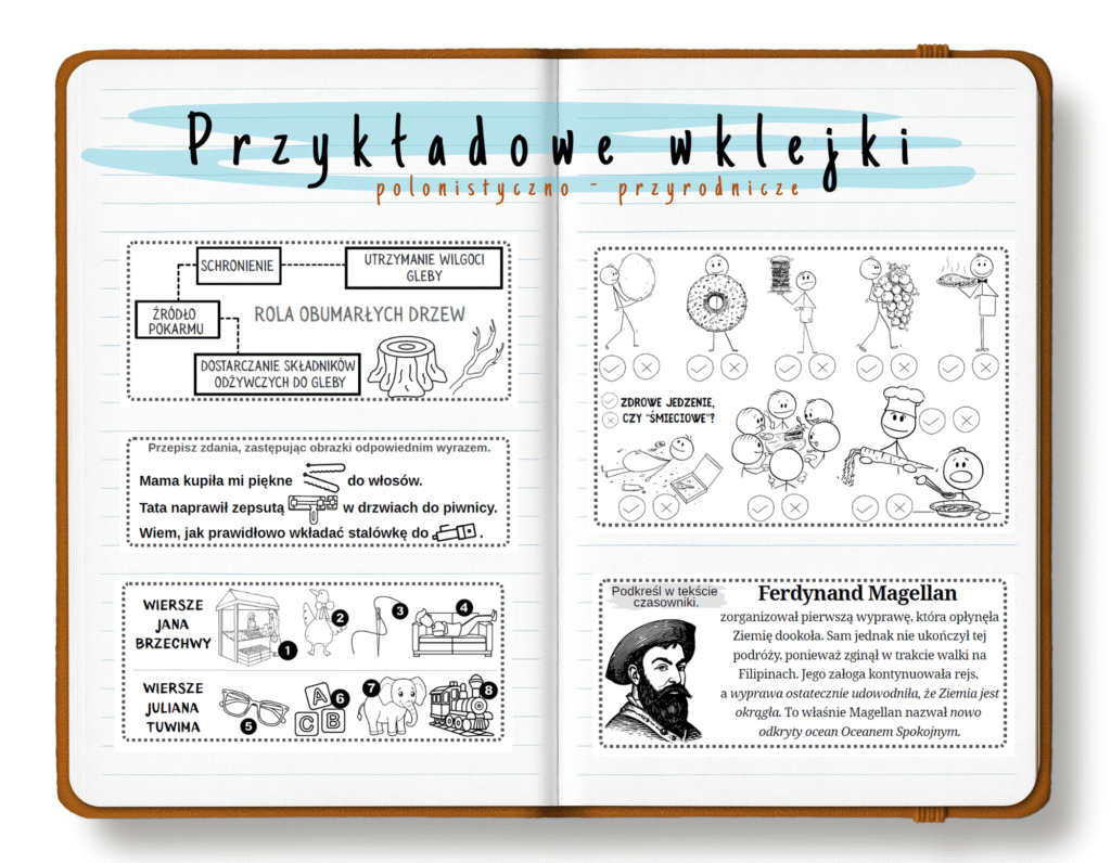 Wklejki zostały przygotowane w taki sposób, aby były jak najbardziej praktyczne i czytelne. Znajdziesz w nich treści informacyjne, które są kluczowe do zapamiętania ważnych informacji oraz ćwiczeniowe, pomagające utrwalić omawiany z uczniami materiał. Dzięki naszym materiałom, nauka stanie się bardziej interesująca i efektywna!