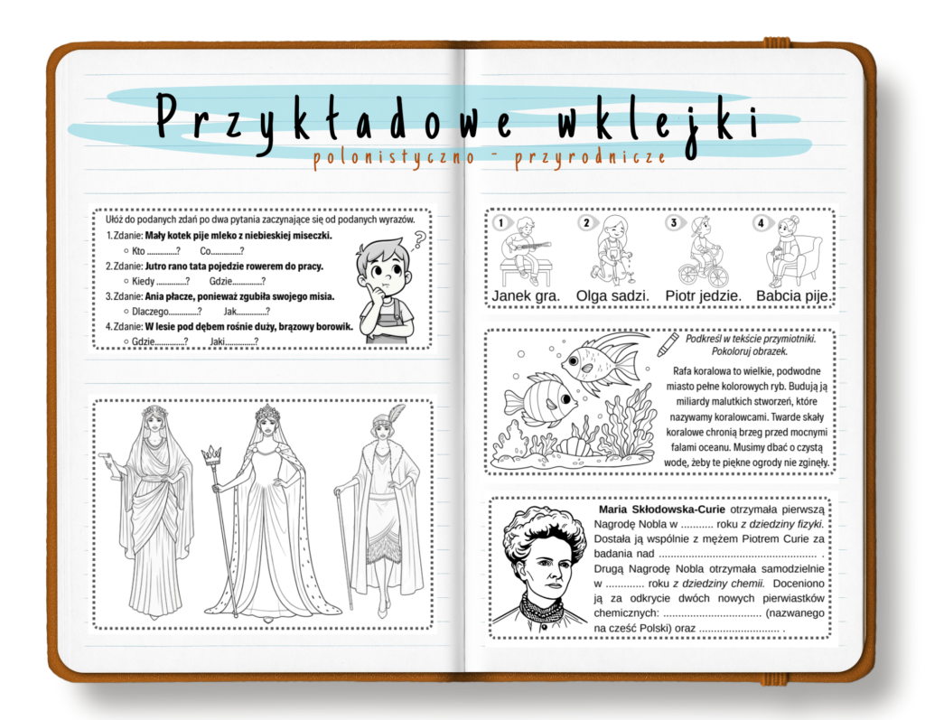 Wklejki zostały przygotowane w taki sposób, aby były jak najbardziej praktyczne i czytelne. Znajdziesz w nich treści informacyjne, które są kluczowe do zapamiętania ważnych informacji oraz ćwiczeniowe, pomagające utrwalić omawiany z uczniami materiał. Dzięki naszym materiałom, nauka stanie się bardziej interesująca i efektywna!